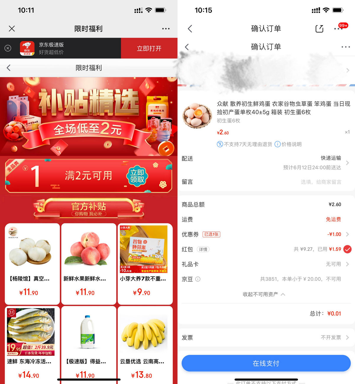 2、加入1件鸡蛋到购物车->最后京东极速版APP扫码下单,自动抵扣券+红包,到手就是0.01元