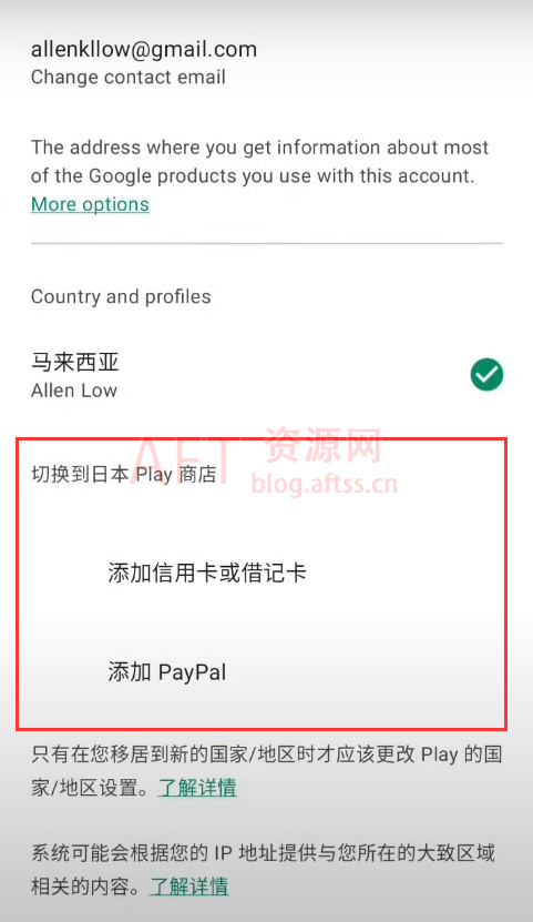 5、这里我们就可以看到国家和地区的信息,现在显示的还是马来西亚,不过IP定位已经到了日本,所以会有切换到日本商店的提示。如果需要切换,我们就要绑定一个付款方式,有两个选择,信用卡或者PayPal,个人建议可以最好用PayPal账户绑定,因为PayPal账户只需要一个邮箱即可申请。