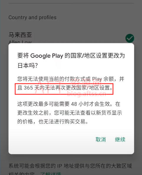 6、点击“添加PayPal”,谷歌商店会提示我们一些提示信息,比较重要的就是,国家地区更改过后,365天内无法再次更改。如果大家确定要改,那就可以点击继续,然后填写日本PayPal账户,就可以成功切换。