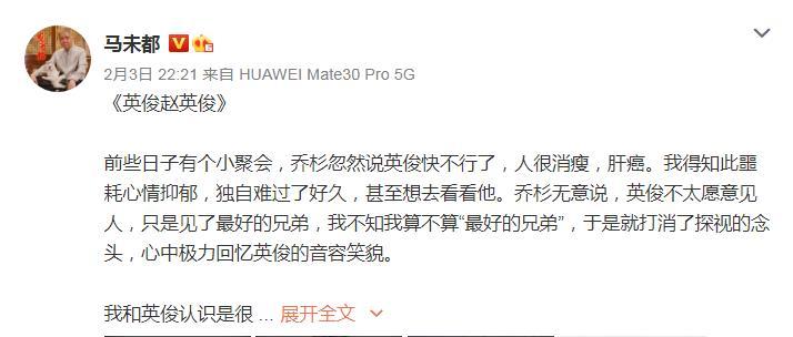 马未都给出了更准确的消息“肝癌”,他是听乔杉说的,因为乔杉和赵英俊是非常好的朋友,此消息不会有错。