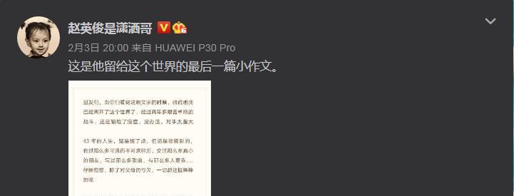 在赵英俊去世的当天晚上,他的亲友用他的微博账号发出了一条消息,配文说“这是他留给这个世界的最后一篇小作文”,其实这是他在生前自己书写的遗书。如果你看这篇遗书的话,你一定会发现他的别有用心,每一段结尾都没有标点符号。