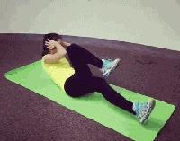 双手扶于两耳旁,用腹肌的力量将肩部和上背部卷离地面,同时转动上身将手肘朝前送,交替触碰对侧膝盖