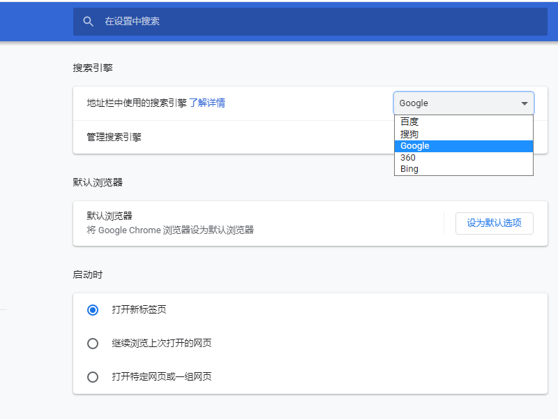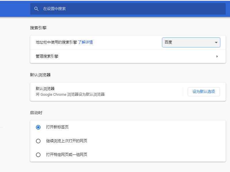 如果你对搜索引擎没有特别的要求,我们在国内,使用百度就好了。我们只需要把谷歌浏览器的默认搜索改成百度即可。