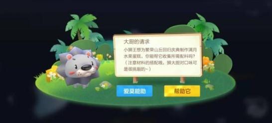 想要顺利的完成任务,就要先了解一下任务的需求。如图所示,我们需要帮助小狮子寻找水果配方,才能顺利的完成蛋糕。