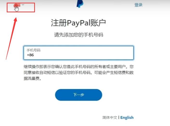 3、在进入的界面,这里需要输入我们的手机号码,注意需要填写我们现在正在使用的手机号码。那么 PayPal到底支持哪些国家的手机号码呢?我们可以点击左上角的这个国旗图标,在下拉框里我们可以看到几乎全世界所有的国家的国旗,由此可见 PayPal是一个全球范围内的支付平台,比如我来自中国,那么我在这里选择中国,然后这里就自动变成了中国的国际区号+86。现在我在这里填上我正在使用的手机号码来注册,然后点击下一步。