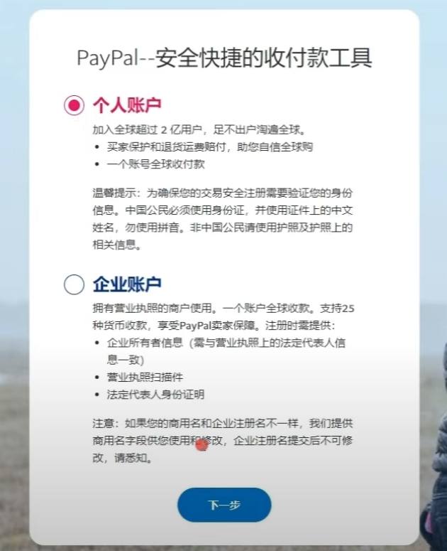 2、然后就会进入到这个页面,我们看到这里有两个选项,一个是个人账户,一个是企业账户。个人账户是针对那些在网上购物需要付款的人和接收付款的人,企业账户就是商人或者卖家,在这里我们要选择个人账户来注册,点击下一步。