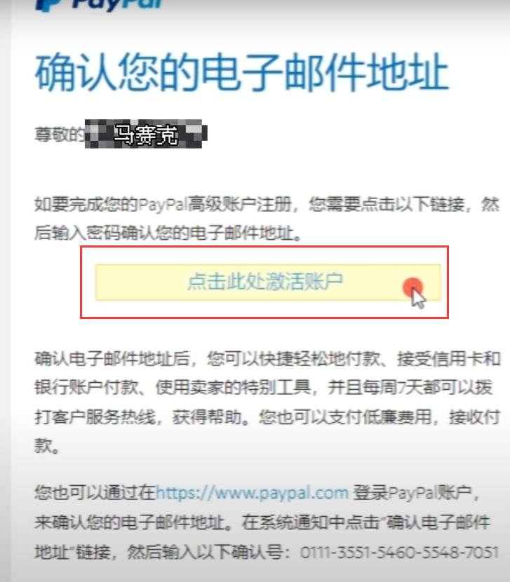 11、现在我们转到自己的邮箱,在收件箱里我们找到来自 PayPal的电子邮件,然后现在我们点击“点击此处激活账户”。