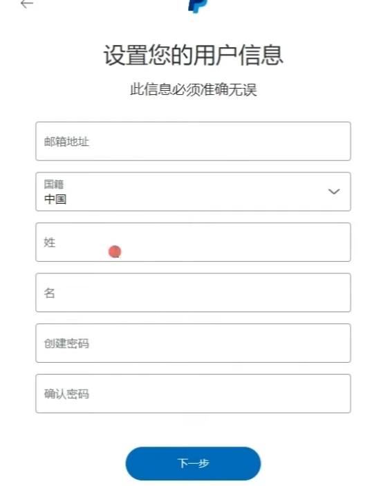 电子邮箱:首先在这里我们需要输入自己的电子邮件地址,因为一会儿 PayPal就会发送一封确认电子邮件到你的邮箱,你需要去邮箱点击验证,以此来激活你的 PayPal账户。